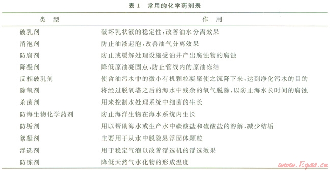海上油氣田的開發(fā)都離不開化學藥劑,這些藥劑主要用來添加到生產(chǎn)流體、海水等介質(zhì)中,以此來提高各有關處理設備的處理效率,保護設備與井口管線,以及延長設備的使用壽命等。常用的化學藥劑如表1所示。