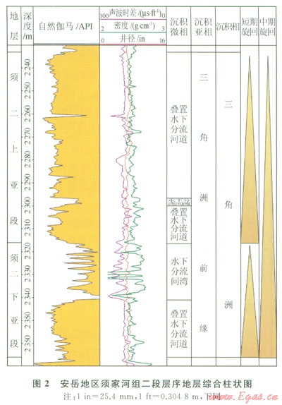 本次研究采用6級劃分方案(巨旋回、超長期旋回、長期旋回、中期旋回、短期旋回、超短期旋回),筆者以Yl05井為例,將須二段劃分為一個中期旋回,即一個上升半旋回,代表基準(zhǔn)面上升,可容納空間增加,對應(yīng)三角洲前緣亞相。該區(qū)典型井沉積微相的測井相模式如表1所示。這一時期總體上為一個水域變寬、沉積物粒度逐漸變細(xì)的時期,層序疊加樣式為退積式;在其內(nèi)部進(jìn)而劃分出兩個短期旋回,分別對應(yīng)須二下亞段和須二上亞段,其中須二上亞段GR曲線呈箱狀(2233~2316m),說明有大套砂體疊置,層序疊加樣式為加積式到退積式,識別為可容納空間增加的上升半旋回(圖2)。