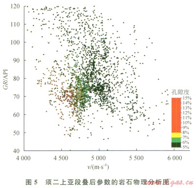 安岳地區(qū)須二上亞段主要為高孔砂巖、致密砂巖和泥巖,從疊后參數(shù)的巖石物理分析結(jié)果看,伽馬、速度、孔隙度各類樣點(diǎn)值分散、疊置,常規(guī)屬性難以區(qū)分出高孔砂巖(圖5)。