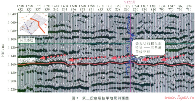 地震相主要是通過地震反射外部幾何形態(tài)、內(nèi)部反射結(jié)構(gòu)、振幅、連續(xù)性、波形排列以及視頻率等特征進(jìn)行識別與劃分。在區(qū)域最大湖泛面(須三段底)拉平地震剖面上,對于整個須二段可見清晰的三角洲前緣亞相疊瓦狀前積反射結(jié)構(gòu),兩個平行的反射層之間存在幾組傾斜的、疊瓦狀排列的同相軸(圖3),可作為判斷物源方向的依據(jù)。但對該區(qū)須二上亞段20~30ms小時窗內(nèi)(厚度50~85m),地震微相特征不明顯,后續(xù)沉積微相的劃分需要借助地震屬性的分析。