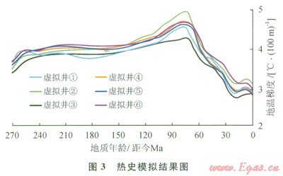 磷灰石裂變徑跡法的熱史模擬步驟為:①根據(jù)已有熱參數(shù)資料,給出熱史約束條件;②設(shè)定大量的溫度時(shí)間曲線,通過(guò)正演求出徑跡長(zhǎng)度、徑跡年齡模擬值;③將正演結(jié)果與實(shí)測(cè)徑跡長(zhǎng)度、年齡進(jìn)行比較,獲得最佳模型,即得到熱史模擬結(jié)果。