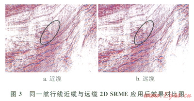首先與傳統(tǒng)的2D SRME進行比較。圖3是同一航行線近遠纜使用2D SRME后的疊加,可以看到近纜2D SRME效果較好,而遠纜效果則較差。這種現(xiàn)象可以從2D SRME的理論基礎(chǔ)來解釋,2D SRME技術(shù)是平面波褶積模型,它沒有考慮到多次波場的三維空間傳播,只有當震源與拖纜在一條航行線上時,2D SRME才會有較好的效果。現(xiàn)在的采集方式多為多纜采集,很難滿足2D SRME理論要求。3D SRME克服了2D SRME的技術(shù)缺陷,考慮了多次波場的三維空間傳播,一方面能模擬更多的多次波場(如繞射多次);另一方面,其模擬的多次波在空間位置更準確,對于后續(xù)的匹配相減更重要。