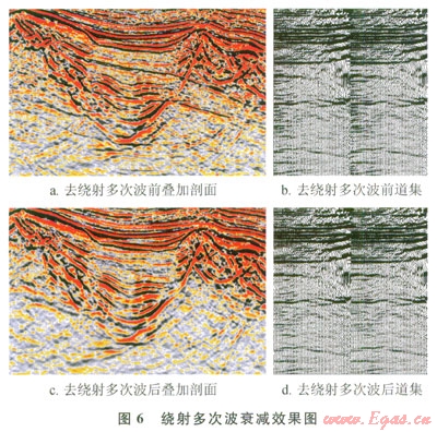 AVO預(yù)測法是通過AVO正演技術(shù)把地震數(shù)據(jù)分解為主要有效波和主要多次波成分[24-25]。對于多次波成分,利用繞射多次波高頻高能特點,采用分頻分能量的方式壓制。多次波成分壓制后,再與有效波成分相加輸出,達到去繞射多次波的效果。從圖6可以看到疊加剖面上繞射多次波得到了很好去除,道集上集中在近道的高頻繞射能量得到了較好衰減。