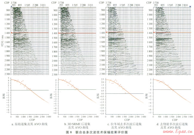 為了驗證該聯(lián)合去多次波技術(shù)的保幅性,在每一個處理階段都加入了AVO分析。從圖8可以看到(拾取時間均為1400ms):在每一個多次波處理階段,其相對振幅是有變化的,而振幅隨偏移距的變化趨勢大體一致。通過這種半定量的評價方式,認為該套聯(lián)合去多次波技術(shù)是保幅的,能夠滿足后續(xù)AVO分析和疊前反演的需求。