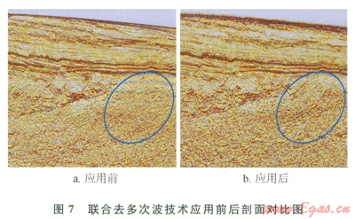 對多次波的衰減能力是評價一項去多次波技術(shù)的首要指標。圖7-a為早期處理剖面,限于技術(shù)僅使用了2D SRME技術(shù)和拉冬域去多次波技術(shù)。圖7-b則使用聯(lián)合去多次波技術(shù)。圓圈標注位置發(fā)育有較多的多次波。新資料多次波壓制效果好,硬基底以下的斷裂系統(tǒng)成像清晰,周邊地震和鉆井已經(jīng)證實斷裂是存在的。