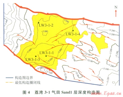荔灣3-l構(gòu)造位于白云凹陷的東南部,處于南部隆起帶伸進白云凹陷的鼻狀凸起上。該構(gòu)造靠近白云凹陷的中心位置,是一個在古近—新近系基底隆起七發(fā)育的受斷層控制的披覆背斜。受南部東西走向邊界大斷層的影響,該構(gòu)造至中中新世已經(jīng)成型,南部南掉大斷層和北部北掉大斷層形成構(gòu)造的南北邊界,東西兩側(cè)受披覆構(gòu)造控制。