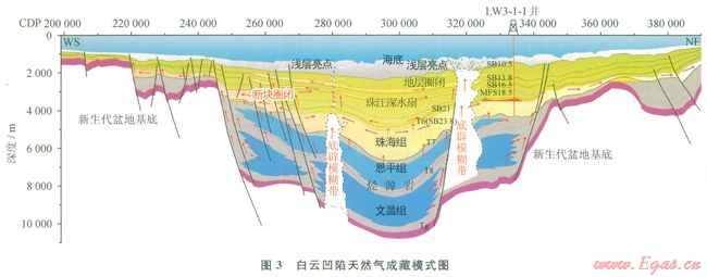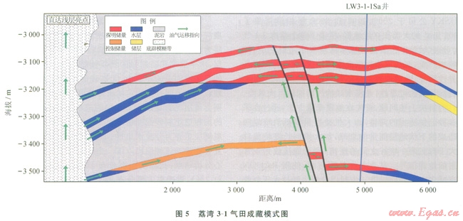 總體說來,荔灣3-1構(gòu)造是一個具有古基底高背景的晚漸新世淺海陸架三角洲體系、早中新世富砂深水扇體系下的斷裂—背斜—地層復合圈閉。其天然氣成藏聚集是近源晚期階段性累積成藏的產(chǎn)物。在中中新世以后(距今8~0Ma),主要來自白云凹陷主洼東部斜坡帶恩平組(現(xiàn)埋深在4600~6000m)有效烴源巖生成的天然氣,通過斷層和流體底辟向上進行垂向運移,然后沿區(qū)域砂體+不整合面+構(gòu)造脊綜合輸導體系進行側(cè)向運移,進入荔灣3-1這個大型的以披覆背斜為主的斷裂背斜地層復合型圈閉,在上覆巨厚的新近系海相泥巖的封蓋下,形成荔灣3-1大氣田(圖5)。