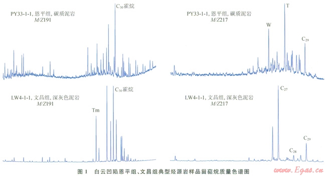 烴源巖樣品有機地球化學分析表明(表1、圖l),恩平組淺湖相、沼澤相烴源巖殘余有機碳含量(TOC)變化大(1.12%~56.18%),生烴潛力指數(shù)(Pg)較高(0.56~97.47mg/g);氫指數(shù)(HI)較低,介于50~300mg/g,有機質(zhì)類型為偏腐殖型干酪根;Pr/Ph為1.6~5.9,沉積環(huán)境變化大;C29規(guī)則甾烷優(yōu)勢,貧4-甲基甾烷系列;富含陸源三萜類生物標志物,如W、T樹脂化合物含量高,奧利烷含量較低—中等。文昌組湖相烴源巖殘余有機碳含量適中(1.00%~2.50%),生烴潛力指數(shù)較高(8.18~l3.64mg/g);氫指數(shù)較高,介于446~566mg/g,有機質(zhì)類型為偏腐泥型干酪根;Pr/Ph為1.4~1.7,沉積環(huán)境為還原環(huán)境;與盆地北部珠一地區(qū)富生烴凹陷文昌組烴源巖特征不一樣,白云凹陷文昌組來源于藻類的C27規(guī)則甾烷含量較高,而貧4-甲基甾烷系列,推測當時可能因處于不同的湖泊環(huán)境,其水生生物的種類也不同而導致;貧陸源三萜類生物標志物,如W、T樹脂化合物和奧利烷含量低(或難于檢測)。烴源巖有機質(zhì)及生態(tài)組分中富含無定型和浮游藻類。