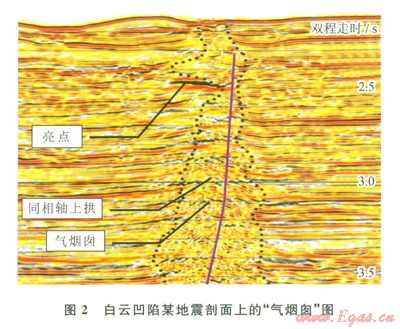 底辟構(gòu)造由地球深部物質(zhì)上拱或刺穿到淺部產(chǎn)生。在含油氣盆地中,流體底辟構(gòu)造是烴源巖垂向幕式排烴和油氣幕式成藏的一種特殊類型。在白云凹陷的地震剖面上發(fā)現(xiàn)了多個流體底辟帶,底辟的頂部到達淺部地層,最高處接近海底。流體底辟作用產(chǎn)生的“氣煙囪”呈直立、上小下大的煙囪狀,局部橫向擴張呈囊狀、花狀,地震反射同相軸被明顯中斷,自身內(nèi)部反射較雜亂、模糊,甚至為空白反射(模糊帶),局部見同相軸上拱或下拉現(xiàn)象(圖2)。