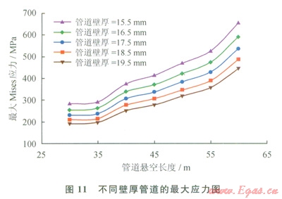 3)以上工況,把管道壁厚分別改變?yōu)?span lang="EN-US">15.5mm、16.5mm、18.5mm、19.5mm,計(jì)算管道最大Mises應(yīng)力的變化情況(圖11),最大Mises應(yīng)力隨壁厚的增加而下降,安全裕度隨壁厚增加而升高。為此,管道壁厚的增加量不能太大,若壁厚過大,為保持管道質(zhì)量不變,必須減少管徑,這會(huì)影響管道輸量;若要保持管道內(nèi)徑不變,壁厚增加太多,勢(shì)必使單位管段的耗材和質(zhì)量劇增,以至管道豎向受力增大。本文僅對(duì)管道壁厚作適度調(diào)整以觀察受力與管材結(jié)構(gòu)變化的關(guān)聯(lián)性,為碳纖維強(qiáng)固提供理論依據(jù)。碳纖維質(zhì)量小于鋼管,自身抗拉能力強(qiáng),對(duì)擘厚影響較小,這些特點(diǎn)可滿足上述分析的需要:即重量變動(dòng)不大、適當(dāng)改變材料組成及結(jié)構(gòu)、提高抗彎能力。