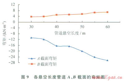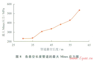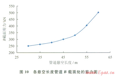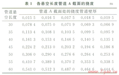 2)保持其他工況參數(shù)不變,改變懸空長(zhǎng)度分別為35m、40m、45m、50m、55m、60m時(shí),汁算管道最大應(yīng)力、彎矩和撓度(見圖8~10和表l)。可見:截面A處撓度最大,截面B處剪力最大,管道易在截面B處發(fā)生剪力破壞。當(dāng)懸空長(zhǎng)度為55m時(shí),管道已接近失效上限,仍處于安全范圍。60m時(shí),管道最大應(yīng)力大于485MPa,此時(shí)管道失穩(wěn),超出安全極限,理論上已失效。