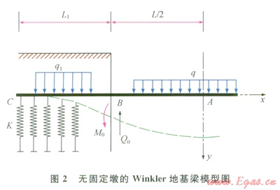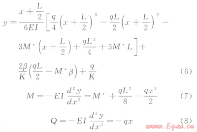 懸空段L:受埋地段兩端的拉伸、懸空與埋地過渡處下滑土的剪切、輸送介質(zhì)重量和管道白重等力的作用。通過力學(xué)等效簡(jiǎn)化,該段為當(dāng)量軸向力(S0,)、彎矩(M0),剪力(Q0)、上部均布載荷(q)作用的大撓度梁。