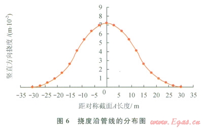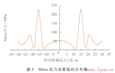 1)圖5、6表示了現(xiàn)場(chǎng)實(shí)際懸空長(zhǎng)度為30m時(shí),應(yīng)力和撓度沿管線的分布情況,可見Mises應(yīng)力和豎直方向應(yīng)力在±15m處最大,而最大撓度出現(xiàn)在模型C-C處,也就是懸空水平對(duì)稱處。