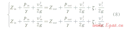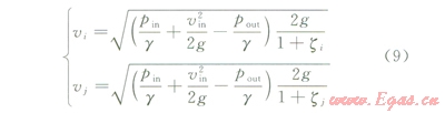以圖l中E點為例,在反向射流作用下,E點流體由于被卷吸而產(chǎn)生低壓效應(yīng),由于高速射流卷吸作用,E點流體流速可近似等于反向射流速度(vj),對E點應(yīng)用伯努利方程計算其流體壓強,可得: