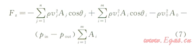 由于所選控制體關(guān)于x軸的對稱,其在y軸方向的動量變化可以相互抵消,故只需分析控制體內(nèi)z軸方向的動量變化和受力情況,故將式(1)投影于x軸可得:
