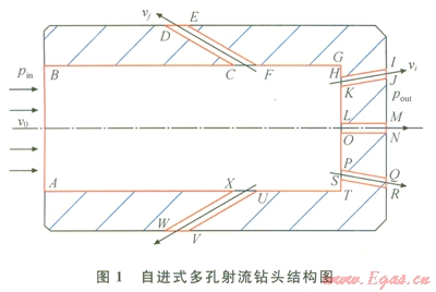 在徑向水平井正常鉆進過程中,向后噴射的高速射流從反向孔眼噴出,射流會從它周圍卷吸流體,由于射流鉆頭前面和四周均為巖石,外界流體補充困難,以至在射流鉆頭后部——環(huán)形區(qū)域形成低壓。由于反向射流是多股均勻分布的,所以在一定條件下可在射流鉆頭后端產(chǎn)生一個密閉環(huán)境的環(huán)形低壓區(qū)。此區(qū)域壓力低于井底環(huán)境壓力,由于壓差作用,會對射流鉆頭和高壓軟管產(chǎn)生一個向前的力,即為反向射流降壓效應(yīng)的自進力產(chǎn)生機理。