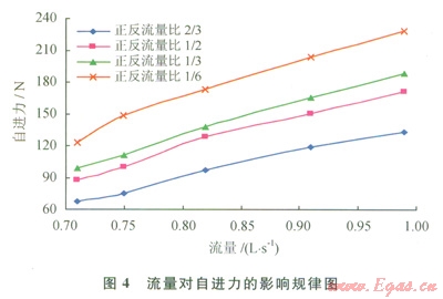 因為實驗用多孔射流鉆頭的反向射流流量均大于正向射流流量,由理論分析可知,射流鉆頭會產(chǎn)生向前的自進力,并且隨著流量的增大自進力也隨之增大。自進力測試實驗也驗證了這一點,如圖4所示。選取正反流量比為2/3、1/2、1/3和1/6的射流鉆頭進行實驗,當正向噴距為10mm,井簡直徑為49mm時,自進力隨著流量的增大也隨之增大,近似呈線性關(guān)系變化。以正反流量比為2/3的射流鉆頭為例,流量為0.71L/s時,產(chǎn)生的自進力為67.8N;流量為0.75L/s時,產(chǎn)生的自進力為74.8N;流量為0.82L/s時,產(chǎn)生的自進力為96.9N;流量為0.9lL/s時,產(chǎn)生的自進力為118.7N;流量為0.99L/s時,產(chǎn)生的自進力為133.2N。這是因為隨著流量的增大,射流的總動量也隨之增大,反向射流產(chǎn)生的反推力更大,反向射流產(chǎn)生的降壓效果也更加明顯。故可以產(chǎn)生更大的自進力。在實驗條件下,流量從0.71L/s增加到0.99L/s,4種不同正反流量比的射流鉆頭所產(chǎn)生的自進力范圍為67.8~228.1N。