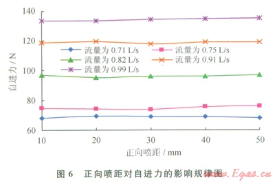噴距是高壓水射流技術(shù)中的一個重要參數(shù),正向噴距是指射流鉆頭前端面與井底之間的距離。如圖6所示,在實驗條件下,選取正反流量比為2/3的射流鉆頭作為研究對象,井筒直徑選取49mm,隨著正向噴距的增大,在同一流量下射流鉆頭產(chǎn)生的自進力變化不大,基本持平。以流量為0.91L/s時為例,噴距為10mm時,自進力為ll8.7N;噴距為20mm時,自進力為ll9.6N;噴距為30mm時,自進力為ll7.8N;噴距為40mm時,白進力為ll8.9N;噴距為50mm時,自進力為ll9.1N。這主要是因為射流所產(chǎn)生的反沖力大小僅與噴嘴出口處流速有關(guān),與接觸靶物時的速度無關(guān),故反沖力大小與正向噴距無關(guān),同時井筒直徑大小不變,改變正向噴距并不影響反向射流的降壓效應(yīng),所以正向噴距對自進力的影響不大。在實驗條件下,井筒直徑為49mm,排量范圍為0.71~0.99L/s,噴距從10mm增加到50mm時,正反流量比為2/3的射流鉆頭所產(chǎn)生的白進力范圍為67.8~135.2N。