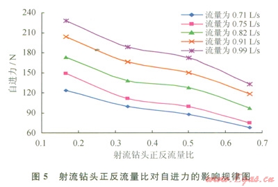當流量不變時,射流鉆頭的正反流量比對自進力的影響就顯得比較重要。通過實驗測量發(fā)現(xiàn),射流鉆頭所產(chǎn)生的自進力隨著正反流量比的增大而減小,近似呈線性關(guān)系變化(圖5)。以噴距為10mm,井筒直徑為49mm,流量為0.99L/s時為例,正反流量比為2/3的射流鉆頭所產(chǎn)生的自進力為133.2N;正反流量比為l/2的射流鉆頭所產(chǎn)生的自進力為171.9N;正反流量比為l/3的射流鉆頭所產(chǎn)生的牽引力為188.5N;正反流量比為l/6的射流鉆頭產(chǎn)生所產(chǎn)生的牽引力為228.1N。這是因為隨著正反流量比的減小,反向射流的流量分配比例增大,反向射流所產(chǎn)生的反推力也增大,同時反向射流的降壓效應(yīng)也越明顯,故可以產(chǎn)生更大的自進力。在實驗條件下,射流鉆頭流量比從1/6增大到1/3,排量在0.71~0.99L/s時范圍,所產(chǎn)生的自進力范圍為67.8~228.1N。