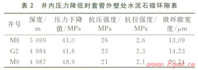 川中地區(qū)高壓天然氣井因Æl77.8mm尾管固井后,采用較低密度鉆井液替換井內(nèi)鉆井液鉆開目的層而使作用在井內(nèi)套管的內(nèi)壓力大幅度降低。該區(qū)塊Æ177.8mm尾管固井時鉆井液密度約為2.20gcm3,而下一次開鉆鉆進時,鉆井液密度降至1.35gcm3左右。M8、G2M9Æl77.8mm尾管固井,氣層封固質(zhì)量優(yōu)良,候凝過程未發(fā)生氣竄,但井內(nèi)壓力大幅度下降后,喇叭口竄氣。該區(qū)塊水泥石楊氏模量10GPa,泊松比0.19,其余計算條件及結(jié)果如表2所示。以套管壁處水泥環(huán)徑向拉應力達到抗拉強度為形成微環(huán)隙的臨界條件[7-8],由公式(3),計算出井內(nèi)壓力下降幅度超過40MPa后,3口井形成寬度l3.0920.24mm的微環(huán)隙,密封能力顯著降低。