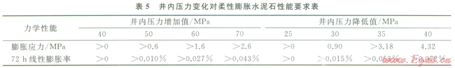 井下作業(yè)公司柔性自應力水泥石能在高圍壓條件下膨脹,產(chǎn)生0.53.0MPa膨脹壓應力,楊氏模量在57GPa,泊松比約為0.19,抗拉強度在2.53.5MPa。當固井后井內(nèi)壓力增加時,通過釋放壓縮應力,減小水泥環(huán)周向拉應力,避免拉伸破壞,同時外觀體積微膨脹,可阻止微環(huán)隙形成。由公式(1)、(2)計算出表5所示不同井內(nèi)壓力變化情況下柔性膨脹水泥石體積膨脹要求。該水泥漿體系在相國寺儲氣庫井技術套管、頁巖氣井的油層套管固井中得到了成功應用,固井質(zhì)量優(yōu)質(zhì),在經(jīng)過試壓、大型體積壓裂作業(yè)后,環(huán)空封固質(zhì)量好,未發(fā)生氣竄。