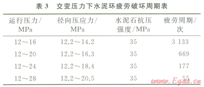 地下儲氣庫井天然氣注入和采出的作業(yè)使作用在井內(nèi)套管的內(nèi)壓力交替變化。這種交變壓力可能引起水泥石內(nèi)部固有的微裂紋緩慢擴展、連通,導致水泥石疲勞破壞[9-11]。以井深2107m的儲氣庫井為例,水平地應力30MPa,井徑215.9mm,套管直徑l77.8mm,壁厚11.51mm,運行壓力1228MPa,水泥石楊氏模量l0GPa,泊松比0.19,根據(jù)水泥石疲勞破壞方程[12]計算出交變壓力作用下普通水泥石疲勞破壞周期如表3所示。儲氣庫井注采氣過程中運行壓力越高,普通水泥環(huán)越易疲勞破壞。當達到最大運行壓力時,只需數(shù)十次注采周期,水泥環(huán)即發(fā)生疲勞破壞。