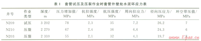 該作業(yè)使作用在井內(nèi)套管的內(nèi)壓力大幅度升高。四川盆地頁巖氣井Æl39.7mm油層套管固井后(套管壁厚9.17mm,井眼尺寸215.9mm)對套管柱試壓及壓裂作業(yè),井口壓力高達60MPa。N203井等井固井質(zhì)量優(yōu)質(zhì)率100%,但試壓或光套管壓裂作業(yè)后均出現(xiàn)環(huán)空帶壓。該區(qū)塊水泥石楊氏模量l0GPa,泊松比0.19,其余計算條件及結(jié)果如表l所示,由公式(1)(2),試壓或壓裂作業(yè)后,套管壁處水泥環(huán)周向應力均超過抗拉強度,發(fā)生拉伸破壞,導致水泥環(huán)密封失效。
