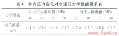 彈性水泥石具備了低楊氏模量、彈性變形能力強的特點,能與套管、井壁協(xié)調(diào)變形,有效卸載,大幅度降低微裂隙及微環(huán)隙形成的可能性。由公式(1)(2)計算出當井內(nèi)壓力變化時,為避免水泥環(huán)破壞,需將水泥石楊氏模量降至適當范圍(4)。以斯倫貝謝為代表的典型彈性水泥石,楊氏模量在3.55.5GPa,泊松比約為0.22,抗拉強度在2.22.5MPa,在儲氣庫得到成功應用,固井質(zhì)量優(yōu)質(zhì),在經(jīng)過試壓及下一次開鉆鉆進井內(nèi)壓力變化后,固井質(zhì)量依然良好,未出現(xiàn)氣竄。