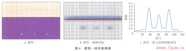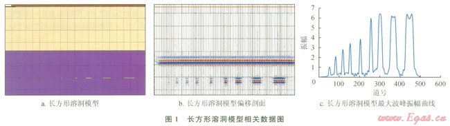 圖6、7分別是模型一和模型二的相關(guān)數(shù)據(jù),由圖6-c可知,模型一中溶洞對(duì)應(yīng)振幅的關(guān)系為:長(zhǎng)方形溶洞>不規(guī)則溶洞>半圓形溶洞,這與溶洞面積關(guān)系是一致的,且模型一中第l個(gè)溶洞和第3個(gè)溶洞形態(tài)大小差距很小,但在最大波峰振幅曲線上依然可以將兩者區(qū)分開,由圖7-c可知模型二也有相似的結(jié)論,故而在菲涅爾帶內(nèi)溶洞形態(tài)對(duì)于振幅是敏感的。