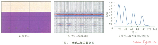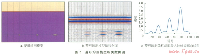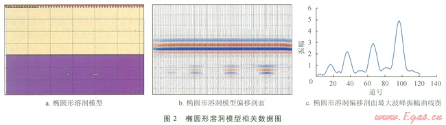 圖2-b是橢圓形溶洞偏移剖面,圖2-c為橢圓形溶洞最大波峰振幅曲線圖;圖3-b、圖3-c分別是菱形溶洞偏移剖面及最大波峰振幅曲線圖??梢钥吹?,無論是橢圓形模型還是菱形模型,隨著溶洞橫向尺度的增加最大波峰振幅是增加的,這和長(zhǎng)方形溶洞正演模擬結(jié)果很相似。
