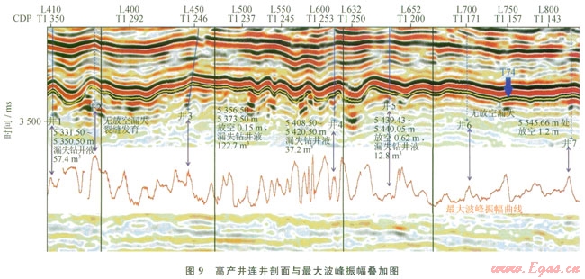 圖9為某區(qū)塊連井剖面與其儲(chǔ)層段最大波峰振幅曲線疊合圖。由圖9可見,這些井除井2、井6外,都設(shè)計(jì)在“串珠”或“羊排”這些具有溶洞反射特征的位置上,同時(shí)它們都對(duì)應(yīng)著最大波峰振幅曲線的極大值點(diǎn),且井l、井3、井4、井5和井7都有鉆具放空、鉆井液漏失等表征溶洞發(fā)育的證據(jù),而井2位于兩“串珠”之間,井6未在“串珠”上,這兩口井均無放空漏失現(xiàn)象,即是無溶洞發(fā)育,可見振幅曲線出現(xiàn)極值是溶洞反射特征之一,但并不是所有極值都意味著溶洞發(fā)育。隨著這些井對(duì)應(yīng)振幅的減小,其產(chǎn)量總的來說是減小的,而產(chǎn)量作為一種衡量溶洞大小及發(fā)育程度的指標(biāo),可見反射振幅越大的溶洞,其尺寸越大,發(fā)育程度越高,這與前面的結(jié)論是相符合的。所以通過這種手段識(shí)別溶洞,可指導(dǎo)實(shí)際生產(chǎn),提高鉆探成功率。