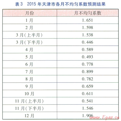 2015年天津市各類用戶天然氣用量預(yù)測結(jié)果見表2。由表2可知,2015年最大用氣量將達(dá)到164.02×108m3,并作為計算2015年季節(jié)調(diào)峰儲氣量的基礎(chǔ)數(shù)據(jù)。2015年天津市各月不均勻系數(shù)預(yù)測結(jié)果見表3,由于3月15日、ll月15日分別為供暖期結(jié)束和供暖期開始時間,因此這兩個月的上下半月不均勻系數(shù)變化較大。