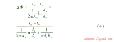 對(duì)于水平安裝供熱管道,設(shè)定絕熱層熱導(dǎo)率與方向無(wú)關(guān)且等于測(cè)點(diǎn)n方向的熱導(dǎo)率ln,根據(jù)式(3)與能量守恒定律,以測(cè)點(diǎn)所在圓為分界線,測(cè)點(diǎn)內(nèi)圓絕熱層與測(cè)點(diǎn)外圓絕熱層的熱流量相等。供熱管道單位長(zhǎng)度熱損失DF可寫為: