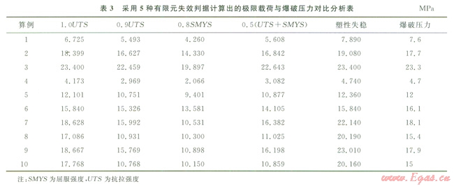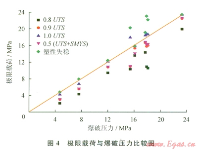 從圖4可以直觀地看}H:當管道缺陷最深處的平均Von Mises等效應力達到極限拉伸強度l.0UTS時,計算出的管道極限載荷最接近真實爆破壓力值;當Von Mises等效應力等于0.8UTS、0.9UTS和0.5(UTS4-SMYS)時得到的極限載荷過于保守,都小于真實爆破壓力值;而當達到塑性失穩(wěn)時,得到的極限載荷值部分大于真實爆破壓力,具有不安全性。