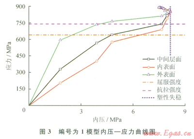 圖3為l0組爆破試驗有限元計算的內(nèi)壓應力曲線圖(以編號為l模型為例),取中間節(jié)點的曲線做插值計算。分別計算當中間節(jié)點的Von Mises等效應力等于0.8UTS、0.9UTS、1.OUTS、0.5(UTS+SMYS)和塑性失穩(wěn)時的壓力值。