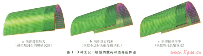 1)經(jīng)過分析可知,3種工況下管道兩端的約束各不相同:加封頭的爆破試驗管道兩端橫截面受軸向應力;端部密封的爆破試驗的管道兩端可以忽略管道兩端所受的軸向應力,近似認為不受約束;埋地長輸管道兩端沒有軸向應力的約束,管道軸向位移為零。