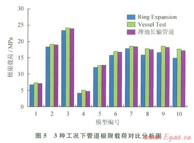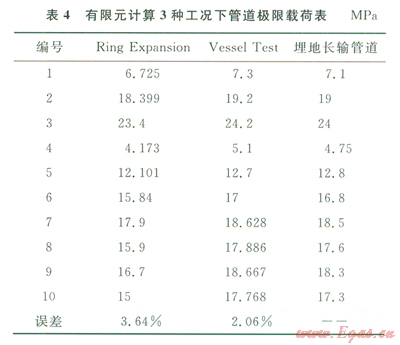 基于已確定的適合高強度管道的失效判據(jù),采用有限元分析方法模擬3種工況下管道的失效情況。圖5對3種情況下計算出的極限載荷做了對比分析。表4為3種丁況下管道極限載荷的對比值,通過對比分析可看出:加封頭的爆破試驗與埋地管道的預測極限載荷吻合度更高,l0組誤差的標準偏差值為2.06%;兩端密封的爆破試驗比埋地管道的預測極限載荷要小,l0組誤差的標準偏差值為3.64%。在實際工程試驗中,建議用加封頭的爆破試驗來預測埋地管道的極限載荷;用兩端密封的爆破試驗來預測真實埋地管道的失效情況,得到的預測結(jié)果偏保守。