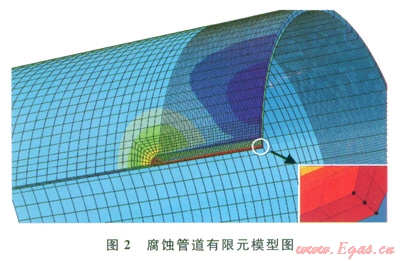 取在內(nèi)壓作用下管道腐蝕區(qū)域應力最大處沿厚度方向的3個節(jié)點,3個節(jié)點分別位于缺陷最深處沿壁厚方向的外表面、內(nèi)表面和中間層面(圖2)。