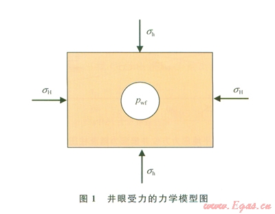 任何一口油氣井鉆開(kāi)前原地應(yīng)力就已存在于地層巖石中,油氣井眼鉆開(kāi)后,井內(nèi)流體壓力取代了被鉆巖層提供的支撐,無(wú)疑會(huì)引起井眼周?chē)鷰r石應(yīng)力的重新分布[21-22]。假設(shè)井眼周?chē)牡貙訛槎嗫讖椥越橘|(zhì),其應(yīng)力分布可用以下力學(xué)模型求解:在無(wú)限大平面上,一圓孔受均勻的內(nèi)壓,而在這個(gè)平面的無(wú)限遠(yuǎn)處受兩個(gè)水平地應(yīng)力的作用,在垂直方向上受上覆巖層壓力作用,如圖l所示。由于井周地層應(yīng)力最大的點(diǎn)出現(xiàn)在井壁上[23],筆者僅給出了井壁上的應(yīng)力分布公式。直井井壁圍巖有效應(yīng)力為[23]: