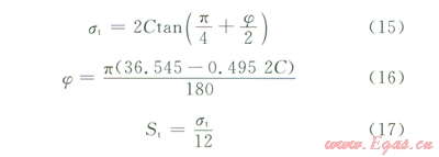 地層強(qiáng)度參數(shù)中對(duì)井壁穩(wěn)定性產(chǎn)生直接影響的是黏聚力和內(nèi)摩擦角,筆者認(rèn)為,黏聚力和內(nèi)摩擦角是巖石相互關(guān)聯(lián)的兩個(gè)強(qiáng)度參數(shù),地層強(qiáng)度的改變會(huì)導(dǎo)致二者同時(shí)發(fā)生變化,不應(yīng)將二者的影響單獨(dú)分析,而應(yīng)直接以單軸強(qiáng)度作為變化量進(jìn)行研究。假設(shè)地層強(qiáng)度參數(shù)服從關(guān)系式(15)[23],且黏聚力和內(nèi)摩擦角滿(mǎn)足經(jīng)驗(yàn)關(guān)系式(16)[24],則可用地層單軸抗壓強(qiáng)度同時(shí)表征黏聚力和內(nèi)摩擦角的變化。分析時(shí)還應(yīng)當(dāng)考慮地層強(qiáng)度變化對(duì)拉伸強(qiáng)度的影響,地層抗拉強(qiáng)度(St)與單軸抗壓強(qiáng)度(st)的關(guān)系由三維Griffith準(zhǔn)則[23]給出,滿(mǎn)足式(17)。
