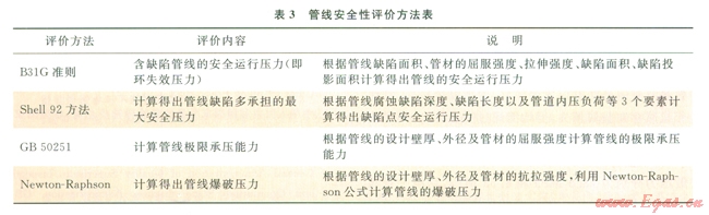 國內(nèi)外通用的管線安全性評價方法主要有修正的B31G準(zhǔn)則、Shell92方法、GB50251中極限承壓計算公式、Newton Raphson公式、《含缺陷油氣輸送管道剩余強度評價方法第l部分體積型缺陷》[10]等(表3)。