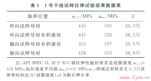 為檢驗集氣干線長期服役后的材料機械性能,對管線試樣進行了屈服強度試驗,試驗結(jié)果見表l。