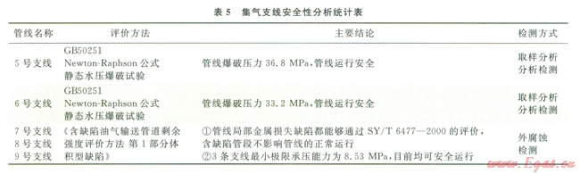對兩條截取管樣的集氣支線和3條進行外腐蝕檢測的集氣支線安全性分析的結(jié)果見表5。