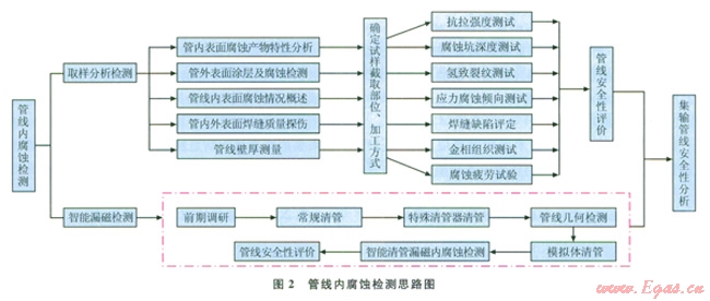 靖邊氣田主要采用取樣分析檢測和智能漏磁內(nèi)腐蝕檢測技術(shù)對開展管線內(nèi)腐蝕檢測工作,檢測思路如圖2所示。