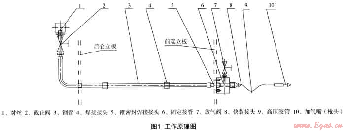 該裝置原理為利用長管拖車氣瓶內(nèi)天然氣和牽弓車儲氣瓶內(nèi)天然氣的壓力差,通過快裝接頭和管道,把長管拖車內(nèi)的高壓天然氣充注入牽引車儲氣瓶中,以達到持續(xù)補氣、續(xù)駛里程的目的。