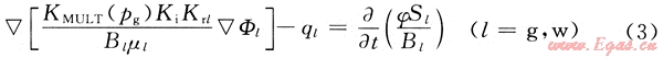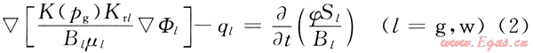 在滲流力學基礎上,從推廣的達西定律和黑油模型出發(fā)建立了三維氣、水兩相流考慮應力敏感的非線性滲流數(shù)學模型[3~4],即