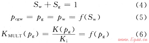式(2)中包含了4個基本變量:pg、pw、Sg、Sw。為了完整地描述方程,還需3個附加的輔助關系式: