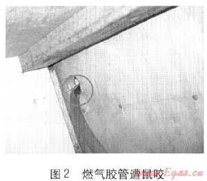 2010年11月5日,溫州市區(qū)康泰大廈一住戶廚房?jī)?nèi)發(fā)生一起燃?xì)獗ㄊ鹿?,造?人受傷、2戶建筑受損,爆炸原因系老鼠咬破膠管引發(fā)燃?xì)庑孤?。膠管被鼠咬是用戶家中安全用氣的最大隱患之一,每年冬春兩季鼠患最為嚴(yán)重。統(tǒng)計(jì)數(shù)據(jù)顯示,2009年公司供氣區(qū)域內(nèi)發(fā)生230起有關(guān)膠管隱患處警,其中膠管被鼠咬有76起;2010年共發(fā)生有關(guān)膠管隱患處警200起,其中膠管被鼠咬有93起,進(jìn)而發(fā)生爆燃的有5起。通常用戶家里所使用的燃?xì)饽z管為橡膠軟管,易被鼠咬(見(jiàn)圖2),用戶在不知道的情況下開(kāi)啟灶具開(kāi)關(guān)就會(huì)產(chǎn)生爆炸、爆燃等事故。