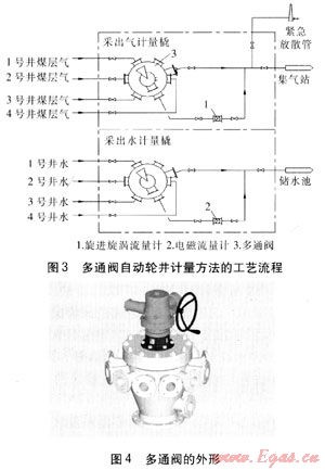 優(yōu)點:采用手動三通閥切換,大大減少了流量計的配置數(shù)量,造價降低。缺點:需要人工定期切換手動三通閥,以保證每口單井連續(xù)計量4~8h。如遇雨雪天氣不能人工進行切換時,會使其他單井排采數(shù)據(jù)的準確性受到影響。單井?dāng)?shù)量多于4口時,需要增加流量計的數(shù)量。造價:采出氣計量橇約6.2×104元,采出水計量橇約4.6×104元。