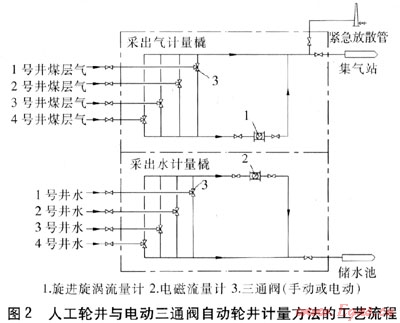 人工輪井計量方法的工藝流程見圖2。在井口將采出的煤層氣壓力調(diào)整至0.2MPa,進入采出氣計量橇,先通過手動三通閥,再經(jīng)旋進旋渦流量計計量后進入?yún)R管,依靠采出氣自身壓力,輸送至集氣站。采出氣計量橇上只設(shè)有1臺旋進旋渦流量計,每口單井的采氣管道與1個手動三通閥連接,手動三通閥的兩個出口分別與旋進旋渦流量計連接以及與匯管直接相連,靠人工定期切換手動三通閥的通斷方向,計量每口單井產(chǎn)氣量。當(dāng)旋進旋渦流量計出現(xiàn)故障或需要校驗時,煤層氣經(jīng)手動三通閥直接進入?yún)R管輸送至集氣站。采出水經(jīng)油管采出后,進入采出水計量橇,計量方法與采出氣計量橇相同,也是靠人工定期切換手動三通閥的通斷方向,計量每口單井的產(chǎn)水量。